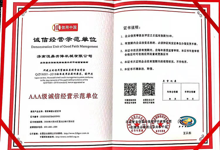 诚信经营示范单位-济南恒鼎升降机械有限公司