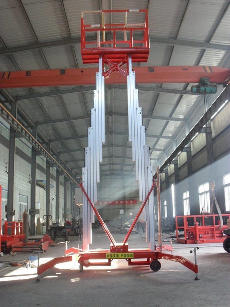 铝合金升降机采用高强度优质铝合金材料,具有造型美观、体积小、重量轻、运转灵活,推行方便。升降平稳、安全可靠等优点。它轻盈的外观,能在极小的空间内发挥更高的举升能力。广泛用于工厂、宾馆、餐厅、车站、影剧院、展览馆等场所,是保养机具、油漆装修、调换灯具、电器、清洁保养等用途的更佳安全伴侣。